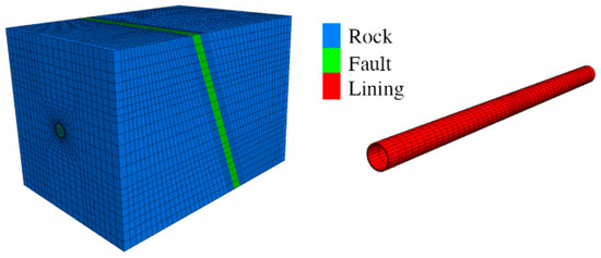 The inlet section of the Lawa Hydropower Station is located in southwestern China, a region with complex geological conditions where the diversion tunnel passes through a number of developing faults. According to the research results, the basic seismic intensity of the area is VIII. The peak horizontal ground acceleration selected for the seismic response analysis in this study was 0.3 g. In order to study the seismic response and safety assessment of hydraulic tunnels across faults, a 3D finite element model, as shown in Figure 3, was established based on this project. The horizontal direction perpendicular to the cave axis was the X-axis, the horizontal direction parallel to the cave axis was the Y-axis, and the vertical direction was the Z-axis. The finite element model ranged from −60.0 to 60.0 m for 120.0 m in the X direction, −85.0 to 85.0 m for 170.0 m in the Y direction, and −60.0 to 60.0 m for 120.0 m in the Z direction. The diameter of the tunnel was 10.0 m, the thickness of the lining was 0.6 m, and it was cast in C30 reinforced concrete with a top burial depth of 55.0 m. The model was discretized using 6-sided 8-node elements, with 125,984 elements and 132,111 nodes divided, including 8928 lining elements. The maximum grid size was no more than 5 m to meet the accuracy requirements of the dynamic time history method of calculation. The model contained a total of three materials: the surrounding rock, the fault, and the lining, and the relevant physical and mechanical parameters were as shown in Table 1. The cohesive force of each contact surface was assumed to be the average value of the cohesive force of the material on both sides of it, and the coefficient of static and dynamic friction of each contact surface was taken as 0.5.