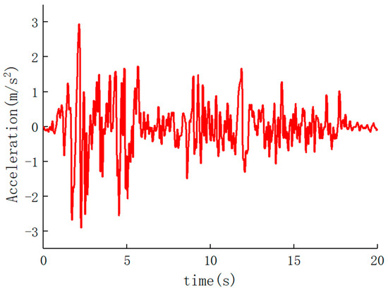 In order to accurately simulate the tunnel construction and seismic response processes, the numerical simulation was divided into three parts: initial ground stress field inversion, static excavation, and dynamic response. By analyzing the test results of the ground stress measurement points, it was decided to use a gravity field with lateral pressure coefficients of , , and , as the initial ground stress field for the static calculations. The stress field from the excavation support calculation was used as the initial ground stress field for the dynamic time calculation. The dynamic calculation used the group’s self-developed dynamic numerical calculation and analysis platform and embedded the dynamic contact force algorithm of the surrounding rock–fault–lining multi-material proposed in this study. An elastic-plastic damage intrinsic model [43] was used for the surrounding rock, faults, and concrete. The model had viscoelastic artificial boundaries on the top and bottom surfaces and free-field artificial boundaries on the four sides. The seismic waves were selected for the first 20 s of the EI-centro wave and were inputted vertically from the bottom of the model by amplitude modulation, filtering, and baseline correction. The calculation considered both x- and z-directional seismic wave excitations. The x-directional ground vibration acceleration time curve is shown in Figure 4, with a peak acceleration of 2.94 m/s2, and the z-directional seismic wave was 2/3 of the x-directional seismic wave.