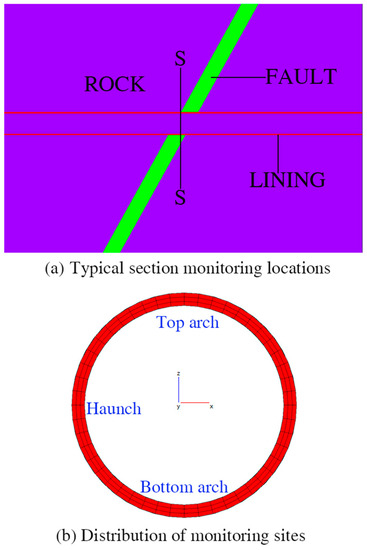 To study the seismic response characteristics of different parts of the tunnel, a typical section and monitoring points were set up as shown in Figure 5, with a fault crossing at the typical section and monitoring points located at the top arch, bottom arch, and haunch of the lining structure at the typical section. In addition, a total of four calculation conditions were set up, as shown in Table 2.
