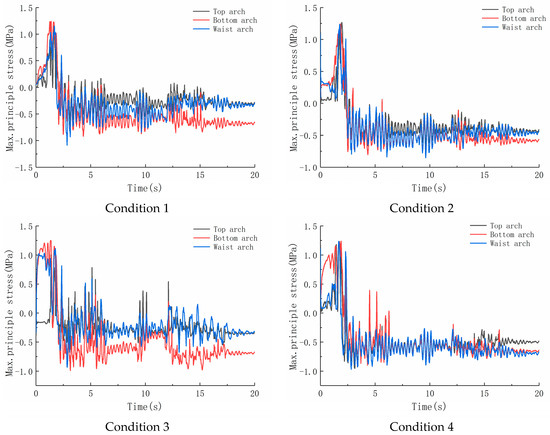 In view of the fact that the compressive strength of concrete materials is much greater than the tensile strength, tensile damage is the most common form of damage, so this study mainly analysed the variation of the maximum principal stress of the lining structure under different working conditions. The time course of the maximum principal stresses at the lining monitoring points for the four working conditions is shown in Figure 6. The maximum principal stress time curves for the top arch, bottom arch, and haunch of the lining under the four working conditions were similar in pattern, with the curves fluctuating sharply in the time period from 0 to 3.0 s, with smaller fluctuations in the time period from 3.0 to 7.0 s, and flattening out in the region after 7.0 s. The pattern of maximum principal stress fluctuations at each monitoring point was similar to the pattern of the input seismic wave acceleration time curve.