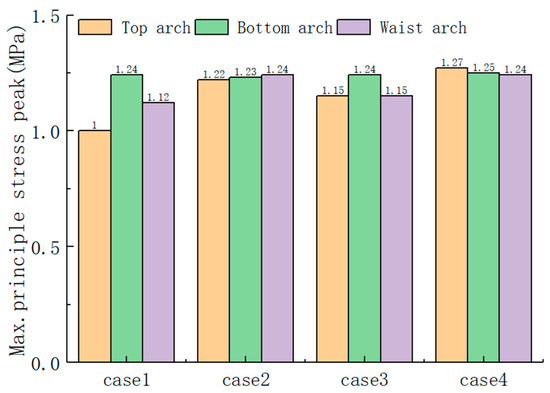 The maximum peak principal stress at each monitoring point under different working conditions is shown in Figure 7. The maximum peak principal stress in the bottom arch was basically unchanged under each working condition, with a value of about 1.24 MPa. The maximum principal stress peak in the top arch at condition 1 was 1.0 MPa; compared to condition 1, the maximum principal stress peak in the top arch at conditions 2, 3, and 4 increased by 0.22 MPa, 0.15 MPa, and 0.27 MPa, respectively. The maximum peak principal stress in the girdle arch at condition 1 was 1.12 MPa. Compared to condition 1, the maximum peak principal stress in the girdle arch at Conditions 2, 3, and 4 increased by 0.12 MPa, 0.03 MPa, and 0.12 MPa, respectively. Comparing the four working conditions, it can be seen that the contact of different materials will aggravate the seismic response of the lining structure and increase the maximum principal stress peak, which is more likely to cause lining cracking damage and affect its normal operation.