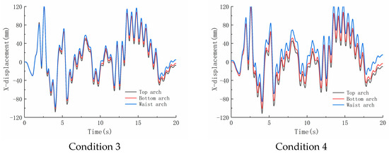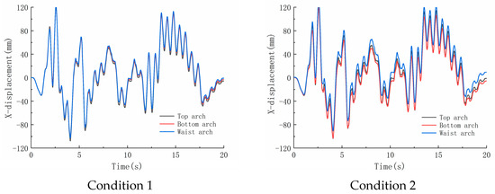 The time course of displacement in the x-direction at the monitoring points of the lining structure under the four working conditions is shown in Figure 8. The displacement–time curves of the top arch, bottom arch, and haunch of the lining under the four working conditions were basically the same, and the wave peaks and troughs appear almost simultaneously, indicating that all parts of the lining were in a synchronous vibration state. The displacement of the lining haunch was greater than that of the top and bottom arches in all four working conditions due to lateral ground vibrations. There was a relatively small difference in relative displacement in the x-direction between the haunch and the top and bottom arches in Condition 1. The difference in relative displacement in the x-direction between the haunch and the top and bottom arches was significantly greater in Conditions 2, 3, and 4 compared to Condition 1, which shows that the contact of the different materials considered exacerbated the seismic displacement response of the lining structure.