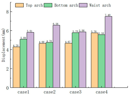 The total displacement of the tunnel lining structure monitoring points after the earthquake is shown in Figure 9. The post-earthquake displacement of the haunch was the largest in all four conditions. The post-earthquake displacements of the top arch, bottom arch, and haunch at the monitoring points were 4.28 mm, 5.09 mm, and 5.81 mm, respectively, for Condition 1. Compared to Condition 1, the post-earthquake displacements of the haunches increased by 0.75 mm, 0.05 mm, and 1.68 mm for Conditions 2, 3, and 4, respectively. A comparison of the four scenarios shows that the displacement seismic response of the lining was intensified after the contact between different materials, where the mutual contact between the three materials of the surrounding rock–fault–lining is considered to be the most dangerous.