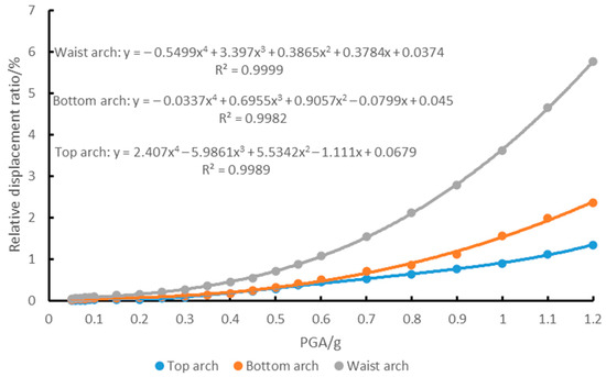 Figure 10 depicts the relative displacement ratio against the PGA curve for various lining monitoring points, and was satisfactorily fitted using a 4th-order polynomial fit. The top arch, bottom arch, and haunches were as follows: , , and .