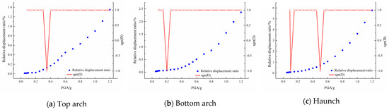 Figure 11 depicts the change in the relative displacement ratios and mutation eigenvalues as the PGA changed. For the top arch, when and , the relative displacement ratio was in a steady state of growth. When , the value of became negative and then positive, and it can be judged that the top arch had undergone a mutation according to the mutation condition. When and , the relative displacement ratio of the top arch entered another steady state of growth.