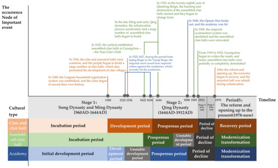 Figure 3. The development context of clan halls, assembled-clan halls and academies and important events on a developmental timeline.