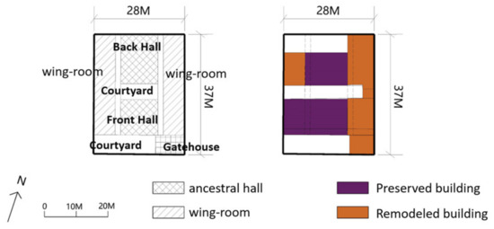 The form of Building Type 1 is based on the continuation and inheritance of clan hall culture and academy culture. Considering that the traditional clan halls represent clan hall culture and academy culture, the core spatial elements of clan halls include spatial sequences, orientations, architectural forms, as well as the intrinsic gatehouses, materials, and traditional roofs. Although the traditional form of assembled-clan halls was somewhat damaged in the fourth stage, the core elements have been partially preserved. However, the activities of addition and renovation carried out to address housing shortages after the founding of the People’s Republic of China posed a significant threat to the continuity of traditional elements. Due to the addition and renovation of some buildings, the roofs and structures of the modified parts were damaged, and changes in building functions led to changes in spatial sequences. Nevertheless, the entrance spaces and axial sequences of the buildings have been well-preserved.