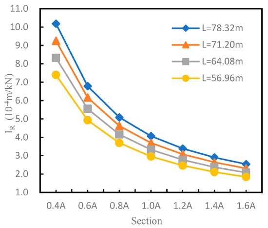 To analyse the effects of the rise-to-span ratio on structural robustness, an initial span of L = 71.20 m was taken as an example of a constant structural span. As shown in Table 3 and Figure 3, at different element sections, the structural robustness indices were calculated at rise-to-span ratios (F/L) of 1/16, 1/13, 1/10, and 1/7. The results indicated that at the same element section, a larger rise-to-span ratio was associated with greater robustness. For example, in the original element section, when the rise-to-span ratio decreased from 1/13 to 1/16, the structural robustness index increased from 3.697 × 10−4 to 4.381 × 10−4, an increase of 18.5%. However, when the rise-to-span ratio increased from 1/13 to 1/10 and 1/7, the structural robustness index reached 2.927 × 10−4 and 2.016 × 10−4, respectively, increases of 20.8% and 45.5%, respectively.