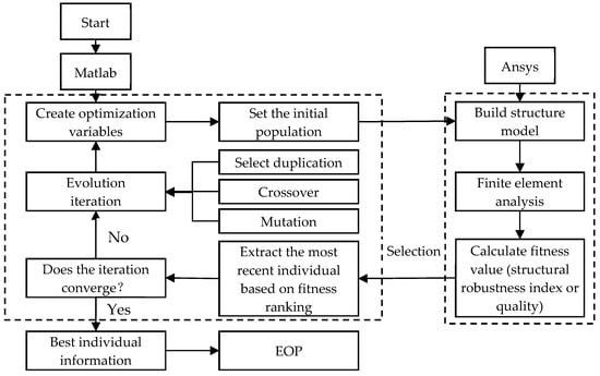 Considering the effects of the various element sections and structural shapes on structural robustness, a genetic algorithm was used to identify the optimal distribution of the element section material and the structural shape depending on the robustness performance. The main code of the genetic algorithm was written in the numerical analysis software MATLAB 2018, and the structural modelling, node displacement value, and robustness index were calculated in ANSYS. Subsequently, ANSYS was used along with MATLAB to crossread the data. The design process was detailed as follows.
