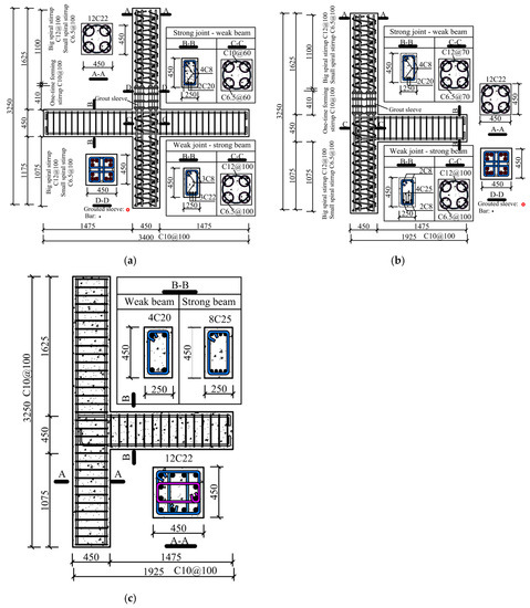 Specimen dimensions and reinforcement details are shown in Figure 1. The longitudinal steel reinforcing bars of the beams and columns were in HRB400 grade. There were 12 longitudinal rebars with diameters of 22 mm in columns of precast joints. For precast specimens expected to fail at beam ends, four 20 mm diameter longitudinal rebars (i.e., two rebars in top and the other two in bottom) were set in the beams, whereas there were six 22 mm diameter longitudinal rebars (i.e., three in top and the other three in bottom) in the beams of joints that would be failed in the core zone. For cast-in-place joints, there were twelve 22 mm diameter rebars in the columns. There were four 20 mm diameter rebars and eight 25 mm diameter rebars set in the beams of cast-in-place joints with target failure modes of beam-end failure and joint failure, respectively. The five-spiral stirrups were used for precast joints, and the details are shown in Figure 2, consisting of a large stirrup (HRB400, 12 mm diameter) and four small stirrups (HPB335, 6 mm diameter). Spacing of the stirrups was 60 mm for the core zone and 100 mm for other regions of columns. Rectangular compound stirrups with diameters of 10 mm were used for the cast-in-place columns, and the spacings were 60 mm and 100 mm for the core-zone and other zones, respectively. Rectangular two-leg stirrups were used for beams in both precast and cast-in-place joints, whose diameters were 10 mm and spacings were 100 mm.