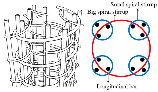The five-spiral stirrup has the potential to enhance the seismic performance of the precast beam–column joint owing to its features of desirable continuity, high confining effect, and convenience in fabrication [19,20]. The five-spiral stirrup consists of four small stirrups, in column corners, to offer high confinement on the concrete in corners and a large stirrup to laterally reinforce the whole section and fix the longitudinal rebars [21]. Several studies were conducted on the seismic behavior of RC columns reinforced by five-spiral stirrups, and the confining effect on enhancing the seismic behavior was investigated. Yin et al. [22] conducted a cyclic loading test (axial compression and lateral cyclic loading) on RC columns, with 10 different types of stirrups, and found that the RC columns with spiral stirrups have higher strength and ductility than the conventional RC columns, among which the five-spiral configuration exhibited the best performance. Fang et al. [23] investigated the axial compression behavior of seawater sea–sand concrete columns reinforced with fiber reinforced polymer (FRP) five-spiral stirrups, and this stirrup type could enhance the deformability of columns. Xiong et al. [19] experimentally investigated the seismic behavior of seawater sea–sand concrete columns with various types of FRP stirrups and found that the five-spiral configuration of stirrups could significantly enhance the seismic performance of columns compared to the rectangular stirrups.