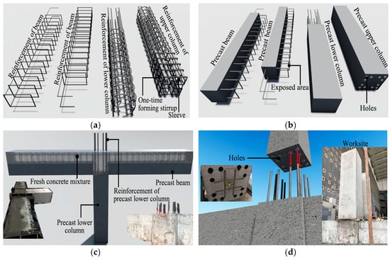 Fabrication process of the precast joints: (a) reinforcement perspective; (b) precast beams and precast columns; (c) assembling process; (d) connecting the precast upper column.