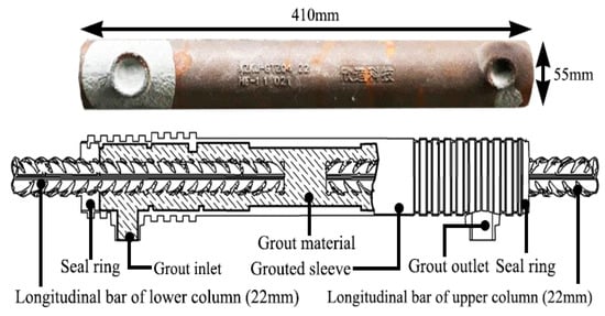 Connection of the longitudinal rebars of the columns was achieved by using the grouted sleeve joint, as shown in Figure 4. Outer diameter and length of the sleeve were 55 mm and 410 mm, respectively. The diameter of the connected longitudinal rebars was 22 mm, and their yield strength and ultimate strength were 438.5 MPa and 585.5 MPa, respectively. The inserted lengths of the rebars in the sleeve were 190 mm and 200 mm. Compressive strength of the grouted material was 93.88 MPa. Before casting the in-situ concrete of the precast joints, properties of the sleeves were measured using the monotonic and cyclic tests, and the key results are summarized in Table 4, where fy is the yield strength, ft the ultimate tensile strength, Asgt is the elongation rate, u0 is the residual deformation by the monotonic test, and u20, u4 and u8 are the residual deformation after 20, 4, and 8 cycles, respectively. The experimental results demonstrated that the grouted sleeve connection had desirable performance and could ensure the integrity of the connection for precast joints.