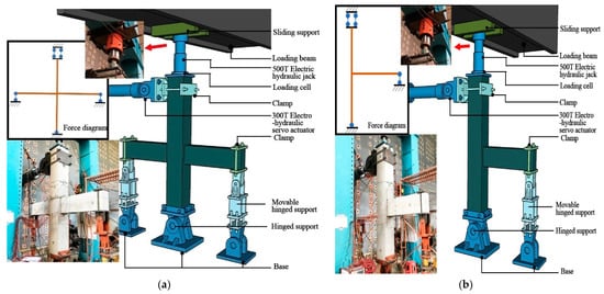 The grade of the concrete was C30, and the mixing ratio was 0.38–1.00–1.11–2.72 for water–cement–fine aggregate–coarse aggregate. There were six 150 mm × 150 mm × 150 mm concrete cubes prepared for each joint to measure the concrete strength. These concrete cubes were cured at a temperature of 20 ± 2 °C and a relative humidity of >95%. The 7 day and 28 day cubic compressive strengths (fcu,k) were measured according to [26], and the results are listed in Table 2. The cyclic test was conducted right after the concrete material test. The steel grade of longitudinal rebars was HRB400, and their diameters included 20 mm, 22 mm, and 25 mm, which were denoted as C20, C22, and C25 for the material test. Diameters of stirrups were 12 mm, 10 mm, and 6.5 mm, and they were labeled as C12, C10, and C6.5, respectively. HPB335 steel was used for the small spiral stirrups, whereas HRB400 steel was used for all the other stirrups. Mechanical properties of steel reinforcements were measured according to [27], and the results are listed in Table 3, where fsy is the yield strength, fsu is the ultimate strength, Es is the Young’s modulus and εsy is the yielding strain.