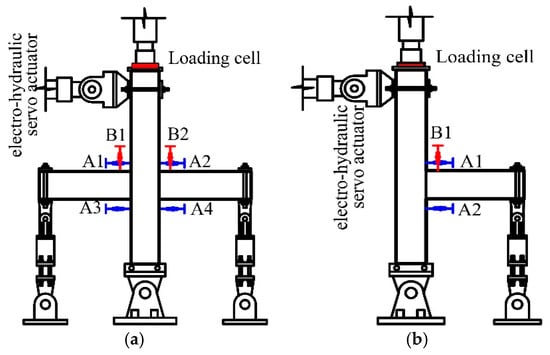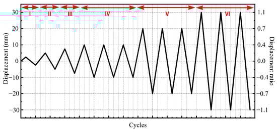 In this study, the axial and lateral loads were applied at the column top, as shown in Figure 5. Sliding and hinged supports were set for the column top and column bottom, respectively. Movable hinged support was adopted for the beam ends. The cyclic lateral load was applied using a 300 ton electro-hydraulic servo actuator with displacement control. The axial compressive load was applied using a 500 ton electric hydraulic jack at column top, and the axial force ratio (i.e., the ratio of applied load-to-compressive capacity) was set as 0.1. The axial force was measured by the load cell set between the column top and jack. The load displacement curve of the specimen was directly measured by a 300 ton electro-hydraulic servo actuator. More details of the test setup are given in Figure 5 for both interior and exterior joints. The layout of linear variable displacement transducers (LVDT) is shown in Figure 6 to measure the deformation of the joint core region. The loading regime of the lateral cyclic load is shown in Figure 7. The displacements for the first 4 steps (i.e., I, II, III and IV) were 2.5 mm, 5 mm, 7.5 mm, and 10 mm, respectively. Thereafter, the displacement increment was set as 10 mm. Additionally, one-cycle was adopted for the first three displacements (i.e., I, II and III), and there were three cycles for the other displacement steps [28]. The experiment was terminated when the applied load dropped to 80% of the peak load or obvious failure in the specimen occurred.