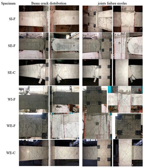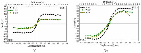 As shown in Figure 9, the pinching effect is more significant for specimens that failed at the joint core zone, proving that the joints that failed at beam ends had more energy dissipation and higher ductility. In the initial loading process, deformation mainly occurred in the beams. Nevertheless, with the increase in the applied load, damage was concentrated in the joint core region for specimens with joint failure mode (i.e., WI-F, WE-F, and WE-C), owing to the low shear resistance of the core region. The comparison of the hysteresis curves demonstrated the reasonability of design codes that adopted the concept of strong joint and weak beam for connection design to ensure the capability of dissipating energy and high ductility. For specimens that failed at the joint core region, the hysteresis curves of precast and cast-in-place specimens (i.e., WE-F and WE-C) were very similar. Nevertheless, the hysteresis curve of specimen SE-F is fuller than that of its cast-in-place counterpart (i.e., SE-C), indicating the beneficial effect of the five-spiral stirrups by offering a higher confinement on the concrete.
