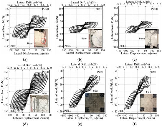Hysteresis curves (lateral load–lateral displacement curves) of the tested specimens are plotted in Figure 9. Generally, the shapes of the curves in the push and pull sides were similar. Owing to the existence of beams in both sides, the hysteresis curves of interior joints showed slightly better symmetry than those of exterior joints. In the initial stage, the loading and unloading curves were coincident, indicating that the joints were in the elastic state, and no residual deformation existed.