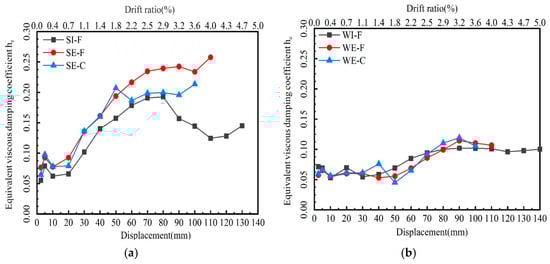 The he of the specimens in each hysteresis loop is summarized in Figure 13, where the horizontal axis is the maximum lateral displacement (average of the push and pull side) within each loop. In the initial loading stage, as the specimens were in elastic state, he is very small (he = 0.05~0.1), indicating the low energy dissipation capacity. For specimens that failed at beam ends, he increased obviously from the lateral displacement of 20 mm, whereas this occurred at 40 mm displacement for specimens that failed in the joint region. As shown in Figure 13, the ranges of he are 0.05~0.26 and 0.05~0.12 for the beam-end failure group and joint failure group, respectively. Specimens that failed at beam ends exhibited a higher energy dissipation capacity than the specimens with joint core region failure. For the beam-end failure group, he of the precast specimen (SE-F) was larger than that of the cast-in-place specimen (SE-C), indicating that the five-spiral stirrups could enhance the ductility and plasticity by offering high confinement on concrete. Nevertheless, for specimens that failed at joint core region, he of the precast and cast-in-place specimens was similar. This indicates that, for the joint failure group specimens, the five-spiral stirrups have no significant improvement effect on the energy dissipation capacity of prefabricated beam–column joints.