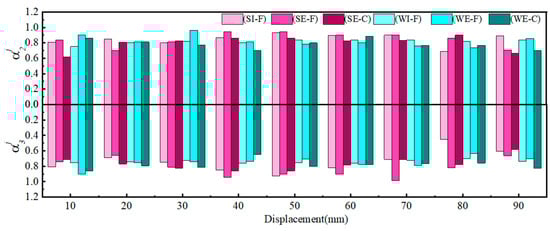 With the increase in displacement, the strength degradation coefficients of all specimens exhibited an overall trend of initially increasing and then decreasing, but they all remained above 0.5, indicating good load-bearing capacity of the specimens. In the displacement range of 60–90 mm, there was a significant decrease in αij, which is attributed to the severe damage to the joint regions. In the beam-end failure group, during the initial loading stage, the strength degradation coefficient of the precast joint SE-F is higher than that of the cast-in-place joint SE-C. This indicated that the prefabricated joint exhibited less strength degradation during the initial loading stage compared to the cast-in-place joint. After the displacement exceeded 40 mm, the values of αij for the beam-end failure group specimens began to increase, indicating a reduction in the degree of strength degradation. For most displacements, the values of αij of the precast specimens were higher than those of the cast-in-place specimens. Taking a displacement of 50 mm as an example, the average values of αij for the prefabricated joint SE-F were 7.0% higher than those of the cast-in-place joint SE-C. This suggested that, when designing the beam–column joints for beam-end failure, the configuration of five-spiral stirrups in the core region of the joint could mitigate the degree of strength degradation in prefabricated beam–column joints, surpassing the performance of cast-in-place joints. For the joint failure group specimens, at displacements of 10 mm, 20 mm, and 30 mm, the average values of αij for the prefabricated joint WE-F were 2.1%, −1.3%, and 12.5% higher than those of the cast-in-place joint WE-C, respectively. This indicated that the configuration of five-spiral stirrups had a certain mitigating effect on the strength degradation of the beam–column joints when designed for the joint failure mode.