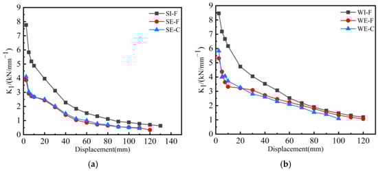 The secant stiffness (Ki) can represent the change of stiffness of a structure under seismic loading. This study used K1 (the stiffness of the specimen during the first cycle) as the stiffness of the specimen at this displacement level, and it plotted a stiffness–degradation curve, as shown in Figure 15. The stiffness–degradation curve reflects the cumulative damage level of the structure during seismic loading.