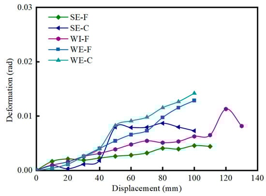 In the initial loading stage, the deformation of the core region in all specimens was relatively small, resulting in small values of γ. As the loading progressed, the shear deformation of the joint core region increased gradually. In the initial stage, the beam-end failure group and the joint failure group exhibited similar levels of shear deformation in their core regions. However, as the displacement increased, the values of γ for the beam–column joints WE-F and WE-C became larger than those of the joints SE-F and SE-C, and the difference increased with the increase in displacement. Taking a displacement of 100 mm as an example, the values of γ for the joints WE-F and WE-C were 182.0% and 94.9% higher, respectively, than those of the joints SE-F and SE-C. This indicated that the beam–column joints designed for joint failure mode exhibited greater shear deformation in their core regions, which explained the occurrence of shear failure in those regions. Furthermore, at a displacement of 100 mm, the values of γ for the cast-in-place specimens SE-C and WE-C were 59.9% and 10.5% higher, respectively, than those of the precast specimens SE-F and WE-F. This indicated that the core region of the precast joints, reinforced with five-spiral stirrups, exhibited stronger resistance to shear deformation compared to the corresponding cast-in-place joints.