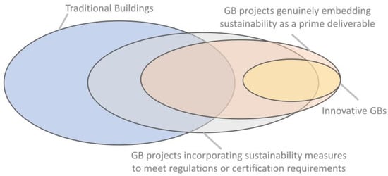 Figure 4. This framework explains different scenarios, for instance, how some buildings are GBs but do not have green certification and how some GBs have green certifications but are not innovative. Many overlaps are possible between a group of innovative building projects, non-GB projects, traditional projects, GBs meeting certifications/regulations only, and GBs striving for self-aspired sustainable goals (i.e., buildings developed based on preselected KPIs). In essence,