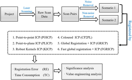 The primary aim of this study is to investigate the impact of different point cloud registration strategies and the potential influence of noise removal on the quality of point cloud registration. The entire exploration process encompasses five steps (Figure 1). Firstly, we collected data on the target bridge structure using a terrestrial laser scanner. Secondly, the original point clouds, or scans, were divided into several scan pairs according to the rule of pairing adjacent scans. Each scan pair consists of a source point cloud and a target point cloud. Thirdly, we established two scenarios. Scenario 1 involves raw scan pairs, meaning no additional processing is performed. Scenario 2 involves noise removal processing on the basis of raw scan pairs, deleting all point clouds irrelevant to the main body of the bridge, primarily including trees, plants, pedestrians, and vehicles. Fourthly, we applied six different point cloud registration algorithms to register the scan pairs in the two scenarios, and then obtained the RE data and the time TC data for each scan pair. Finally, we employed significance analysis and value analysis to process and analyze the RE data and TC data.