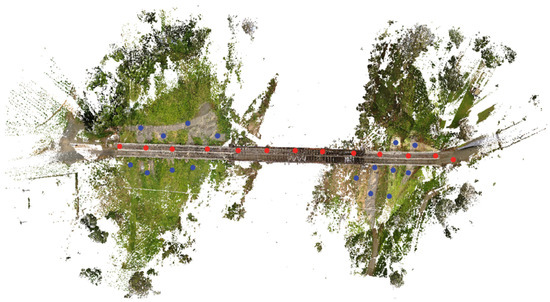 Scan planning. Note: The red markers represent scanning locations on the bridge, while the bule markers denote scanning positions beneath the bridge.