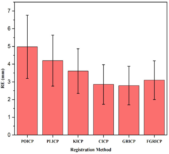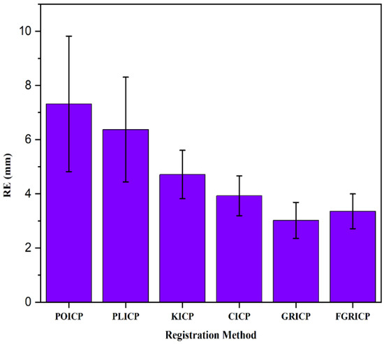 - In conditions without noise removal, the average RE for six different point cloud registration methods, listed from highest to lowest, are as follows: POICP (7.32 mm), PLICP (6.38 mm), KICP (4.71 mm), CICP (3.93 mm), FGRICP (3.36 mm), GRICP (3.02 mm). When operating under conditions with noise removal, the average Registration Error (RE) values from highest to lowest are: POICP (4.98 mm), PLICP (4.20 mm), KICP (3.61 mm), FGRICP (3.10 mm), CICP (2.86 mm), and GRICP (2.79 mm).