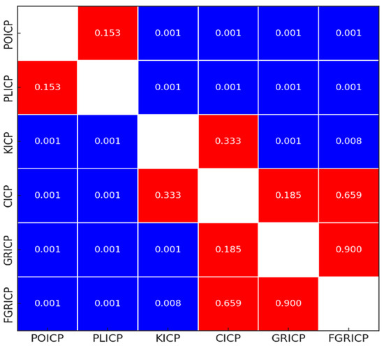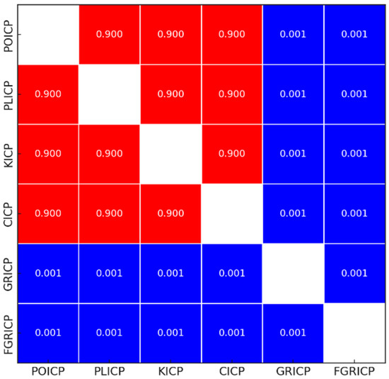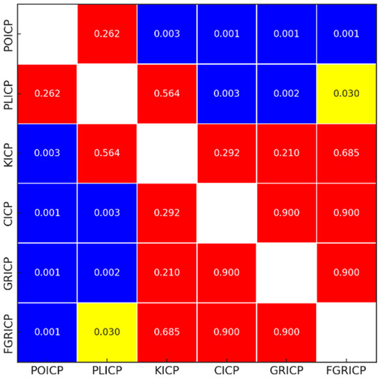 According to the t-test analysis for TC under the same registration method for different conditions (Table 12), we obtained the p-values for the same registration method under different conditions, which were respectively: POICP (0.000), PLICP (0.000), KICP (0.001), CICP (0.000), GRICP (0.000), and FGRICP (0.000). Among these, all point cloud registration algorithms demonstrated significant differences between the conditions of noise removal and non-noise removal. This indicates that noise removal is a universally significant influencing factor on time consumption, and it can very effectively reduce time spent, greatly enhancing operational efficiency.