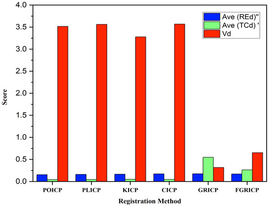 - In the analysis of value engineering, GRICP scored 0.34 and 0.32 under non-noise removal and noise removal conditions, respectively. These are the lowest scores under both conditions, suggesting a relatively low cost-effectiveness. Although when solely comparing the registration error, its averages of 3.02 mm (non-noise removal) and 2.79 mm (noise removal) are among the best in their respective groups, the time consumption is extremely long, at 54.53 min (non-noise removal) and 32.76 min (noise removal), respectively.