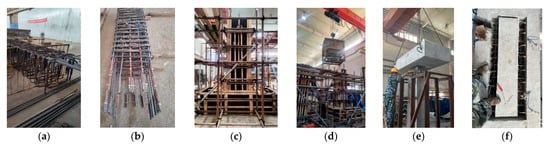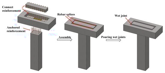 The PSC specimen column height was 256 cm, and its rectangular cross-sectional dimensions were 60 cm × 50 cm, with extended reinforcement on the top of the column. The precast upper cap beams were 22 cm in height and had rectangular cross-sectional dimensions of 150 cm × 32 cm. The precast lower cap beams were 47 cm in height and had rectangular cross-sectional dimensions of 58 cm × 100 cm. The cast-in-place (CIP) cap–column specimen had the same size as the socket precast cap–column connection specimen after assembly. The bottom of the column was precast with steel plates and horizontal anchor holes were reserved for connection with the actuator. Two anchor holes were also reserved on the cap beam to connect the specimens to the floor. The construction process for the PSC specimen is shown in Figure 1 and Figure 2.