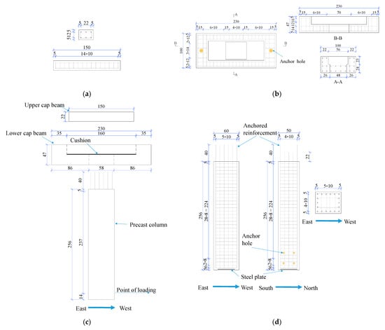 Dimensional and structural details of the PSC specimen (unit: cm): (a) upper cap beam; (b) lower cap beam; (c) front view of the specimen; (d) precast column.
