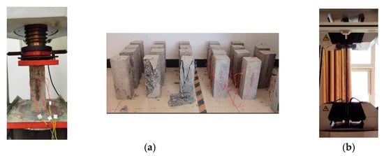 The same rebars were used for material property tests when the reinforcement cages were fabricated. The reinforcement testing method followed that of ASTM code A370 [28]. The material properties of the reinforcement are shown in Table 2. The specimens and wet joints were cast with C40 concrete; the concrete mix is shown in Table 3 [29]. Twelve prisms of 150 mm × 150 mm × 300 mm and twelve 100 mm cubes were reserved and maintained until the test day for the material property tests [30], and the material test setup is shown in Figure 4. The material properties of the concrete are shown in Table 4.