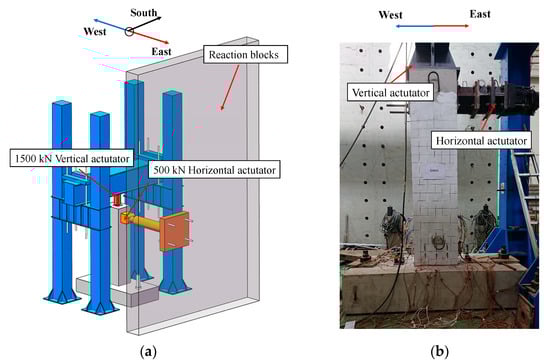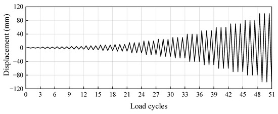 The focus of this test was to assess the reliability of the column–cap beam joint, so the test was conducted on specimens inverted such that the joint was subjected to the most unfavorable bending moment [18]. The test setup is shown in Figure 5. The cap beam was anchored to the floor using anchor rods. The column was subjected to a lateral reciprocal cyclic load and a constant axial load. The vertical load simulated the self-weight of the superstructure borne by the cap beam, which was calculated based on the principle of similarity to obtain a vertical load of 1170 kN. Lateral reciprocating loads of the column were applied by the horizontal actuators, and continuous loads of 1170 kN were applied by the vertical actuators. The lateral cycle loading process for the specimen was controlled by displacement, and each loading level was cycled three times, as shown in Figure 6.
