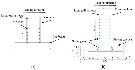 To accurately capture the generation and development of the plastic hinge of each specimen, strain gauges were placed on the longitudinal rebar of the column at five levels [31], as shown in Figure 7. In the precast cap–column socket connection specimen, moreover, additional strain gauges were arranged on the anchorage reinforcement of the precast column and on the horizontal and vertical reinforcements of the precast cap beam to monitor the changes in strain of the socket connection.