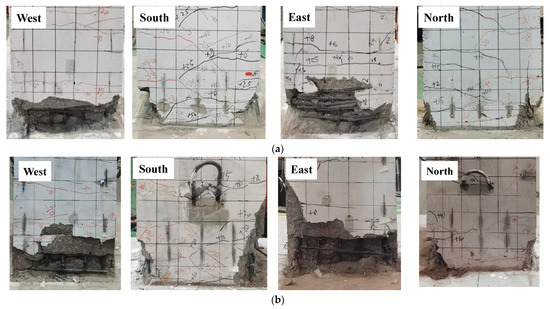For the CIP specimen, the first horizontal crack appeared at a height of 50–100 mm above the interface between the column and the cap beam when loaded to 2 mm, and the maximum crack width was 0.01 mm. When the displacement level reached 10 mm, the crack penetrated through the section, and the maximum crack width reached 0.3 mm. When the specimens were loaded to a displacement level of 20 mm for the first cycle, the strain gauges located on the top of the column monitored the yielding of the longitudinal reinforcement. When the displacement level reached 40 mm, the concrete in the corner started to spall. When the displacement level reached 50 mm, the concrete in the pressurized area spalled across a large area. When the displacement level reached 70 mm, the stirrups were exposed. When the displacement level reached 80 mm, the stirrups and longitudinal rebar flexed, the core area of concrete spalling and the specimen bearing capacity were significantly reduced, and the test was then concluded. The damage process of the specimen during the test is shown in Figure 8a, and the crack distribution and failure state are shown in Figure 9a and Figure 10a, respectively.