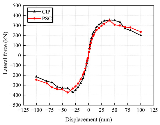 The residual displacement curves of each specimen are shown in Figure 17, which shows that the residual displacement curves of the CIP and PSC specimens basically coincided and tended to be close to 0 before the displacement level reached 30 mm. Continuing to load, the residual displacement of the PSC specimen under each loading level is smaller than that of the CIP specimen. When the loading displacement was greater than 30 mm, the residual displacement of the PSC specimen was smaller than that of the CIP specimen, which is also due to the more obvious pinching of the hysteresis curve in the PSC specimen.