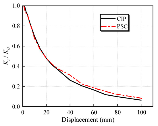 The backbone curves are shown in Figure 12, which shows that each specimen was trilinear with an elastic section, a yielding section and a falling section. Among these sections, the peak lateral load Fp of the CIP specimen was 366.5 kN, and the corresponding peak lateral displacement Δp was 40 mm. The peak lateral load Fp of the PSC specimen was 354.78 kN, and the corresponding peak lateral displacement Δp was 40 mm. The initial stiffness E0 is defined as the average stiffness corresponding to the strength range between 40% Fp and 70% Fp. The initial stiffnesses E0 were 25.37 kN/mm and 21.76 kN/mm for the CIP and PSC specimens, respectively. The ratio of the stiffness K0 to the initial stiffness Ki is shown in Figure 13.