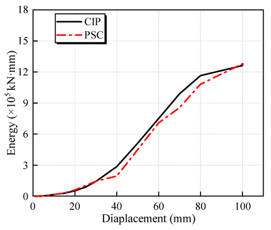 Structural energy dissipation is a key factor in resisting earthquakes. Therefore, ensuring structural non-collapse is of significant importance [35]. The energy dissipation in each cycle at each displacement location is defined by the area enclosed by the hysteresis loop. All calculation results are presented in Figure 15. Before the displacement level reached 30 mm, the cumulative hysteresis loop areas of the CIP and PSC specimens were basically equal. When the displacement level reached 40 mm, the CIP and PSC specimens both reached peak loads, but the hysteresis curve pinching phenomenon in the PSC specimen was more distinct, and its cumulative hysteresis loop area was smaller than that in the CIP specimen. When the displacement level reached 80–100 mm, because the load capacity of the CIP casting specimen decreased faster, its cumulative hysteresis loop area was smaller than that of the PSC specimen.