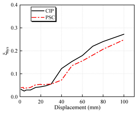In summary, the energy dissipation capacity of the PSC specimen was not much different from that of the CIP specimen, but the viscous damping ratio ξhys was lower, which indicates that the pinching of the hysteresis curve significantly affected the equivalent viscous damping ratio ξhys of the specimen.