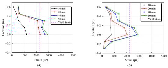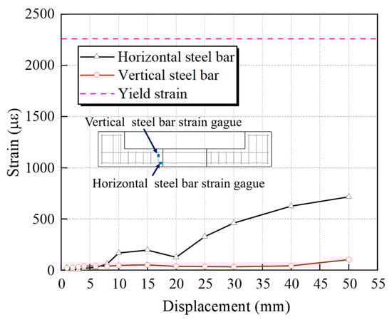 In this study, the yield strain of the longitudinal rebar was 2262 με. The tensile strain development and strain distribution are shown in Figure 18 and Figure 19, respectively.