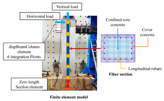 The Open System for Earthquake Engineering Simulation (OpenSees) program was used to simulate RC cap–column connection specimens. In the OpenSees model, the fiber elements of the column section consisted of constrained concrete, unconstrained concrete, and steel reinforcement elements. Both CIP and PSC specimens were divided into 5 dispBeamColumn elements. These elements were displacement-based and modeled the plastic distribution along the element length. The column section was divided into a total of 3118 fiber elements, including 2000 confined concrete fiber elements, 1100 unconfined concrete elements, and 18 steel reinforcement fiber elements. The convergence test showed that the mesh division method can meet the calculation accuracy requirements.