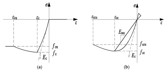 The constitutive material relationships of the concrete are shown in Figure 22. The characteristic values of the steel and concrete materials were described in Section 2.2. Concrete 01 [38], a concrete material with linear degradation in stiffness and no tensile strength, was used to simulate unconfined concrete. The compressive strength of unconfined concrete is fcc, which is equal to fc. Confined concrete was simulated using Concrete 04 material with a tensile strength degradation index. The Mander model [39] was used for confined concrete to calculate the effects of the stirrup on the core concrete, and its parameters were calculated using Equations (3) and (4) [40]: