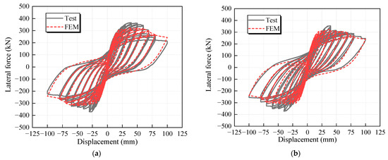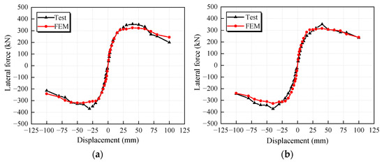 Comparisons of hysteretic responses between FE numerical results and test results: (a) CIP specimen; (b) PSC specimen.