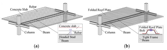 Generally, buildings comprise main structural components (columns, beams, etc.) and secondary components (concrete slabs, folded roof plates, etc.). Earlier reports revealed that the secondary components function as a restraint on the primary structural members. Their restraint performance is generally represented as the spring stiffness or strength [19,20,21,22,23,24,25]. Steel beams are assembled with a concrete slab through shear connectors in an ordinary building with several floors (Figure 1a). It is widely recognized that a concrete slab demonstrates restraint performance along the in-plane direction and out-of-plane direction. Although cracks in the concrete slab originate during cyclically applied stress from the earthquake, enhancement of the buckling strength was confirmed by experimentation [26].