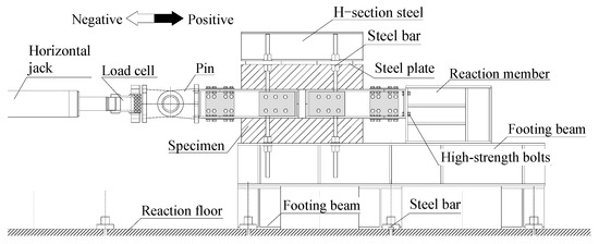Figure 3 presents an illustration of the loading frame. The specimen was placed widthwise on the footing beam. The single side of H-section steel was connected to the reaction member by high-strength bolts. Then, the imposed shear force was transferred to the reaction floor. The shear force was carried cyclically by a 1000 kN capacity hydraulic jack.