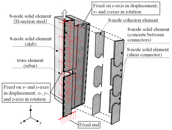 As exhibited in Figure 4, the H-section steel, shear connector, and concrete slab were built with the solid element. The reinforcements were modeled by the truss elements. The reinforcements were settled to resist the axial force only. Therefore, the analysis intended that the rebar yielded by means of the axial force, not by the combined stress of axial force and bending moment. Hence, the truss elements were adopted in the FEA. Also, the slippage was not observed in the preliminary analysis, justifying disregarding the bond fracture in the simulation. Separation through a tensile crack was represented by the 0.1-mm-thick cohesion element. The element was placed on the interface between the concrete block and the concrete between the shear connectors. The respective sides of the cohesion element were tied to the concrete block and the remaining concrete parts. When the deformation was imposed on the shear connector, the cohesion element deformed and carried the reaction force. According to the constitutive law described later, the cohesion element depleted its strength gradually and vanished in the ultimate state. The concrete blocks were therefore discretized after vanishing. The fine mesh was built near the shear connectors, where the stress transfer occurs prominently. Meanwhile, the mesh became coarse around the edge of the concrete slab to save computation time. The preliminary analysis was carried out, and the convergence was observed in the sensitivity study.