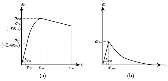 where σcm denotes the compressive strength of concrete and εcm represents the strain at peak strength. An earlier study [64] showed that the strength dropped linearly to 85% of the ultimate strength at the ultimate strain σcu = 0.01.