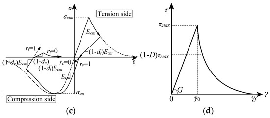 Figure 5d presents the constitutive law of the cohesion element. The shear stress–strain relation was constructed based on earlier experimentally obtained results [69]. The shear stiffness G was calibrated using Equation (8). The damage function D governing strength deterioration was computed using Equation (9). The ultimate shear strength τmax was calculated using Equation (10).